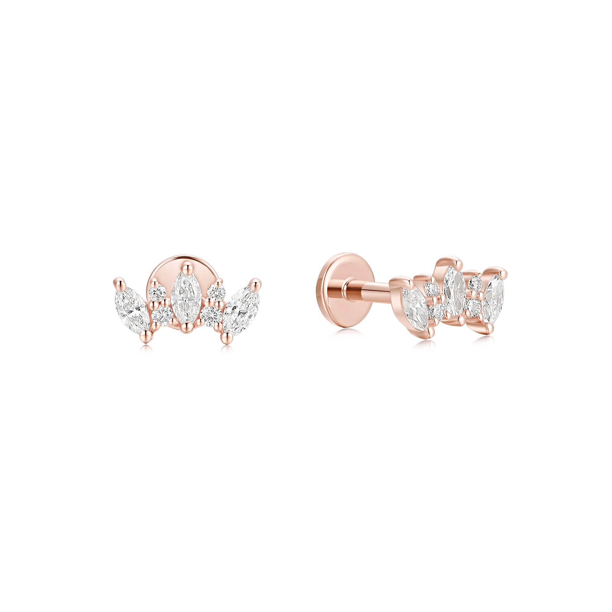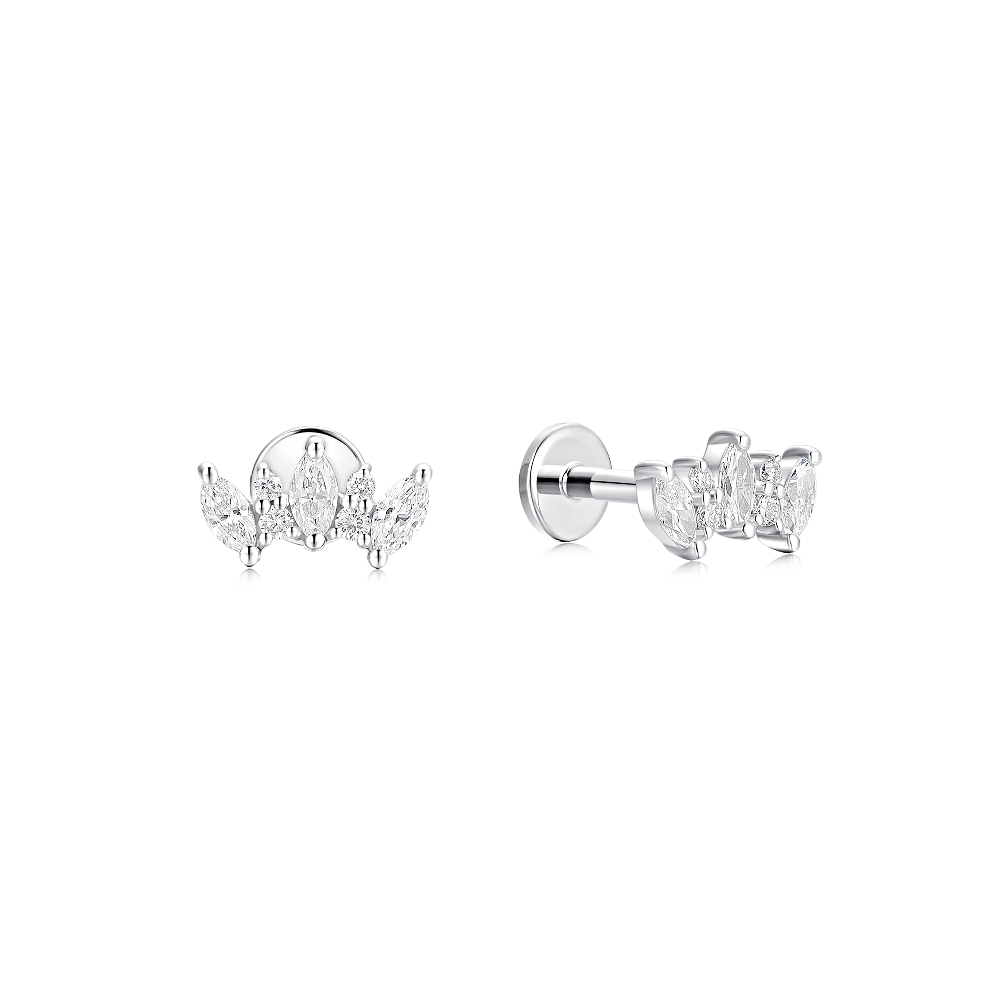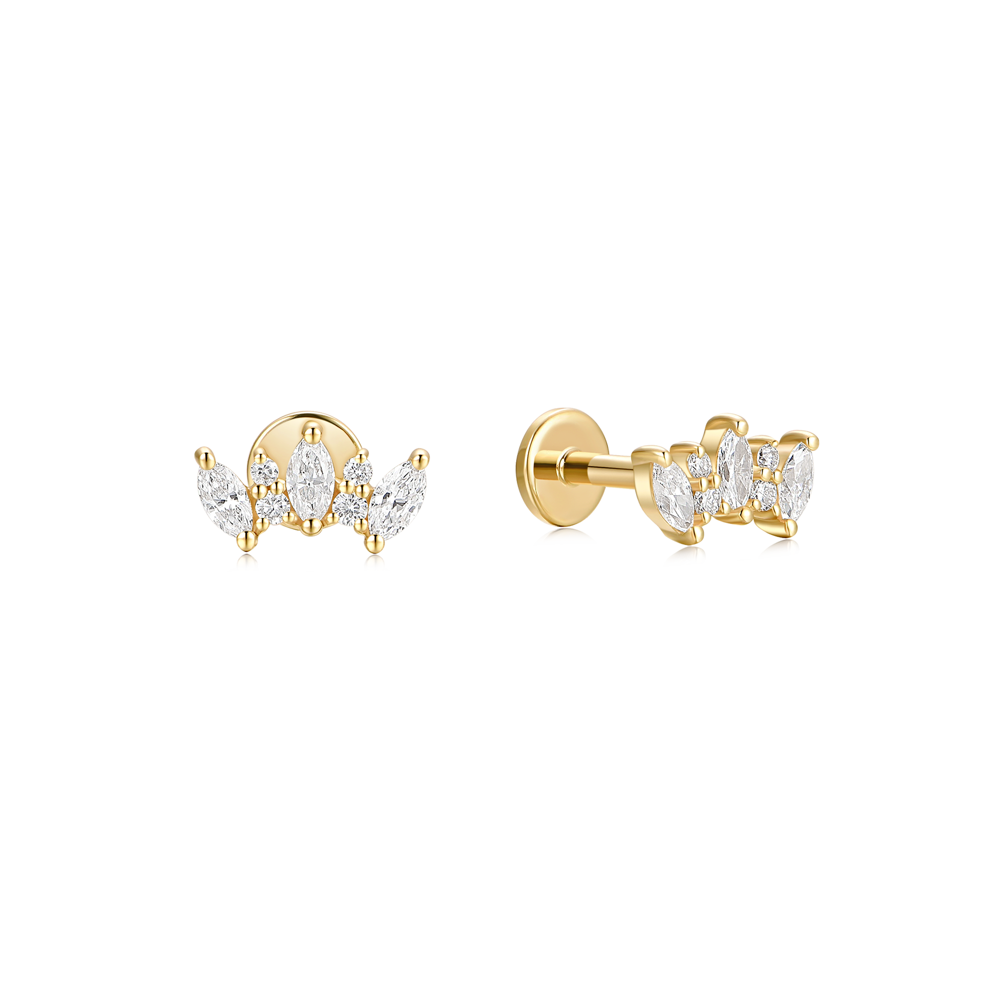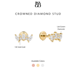 Featuring sparkling marquise cut lab-grown diamonds, these studs are versatile for both ear lobe and helix piercings. With a flat-back design, enjoy comfort and style all in one. Shine bright with our Crowned Diamond Studs!